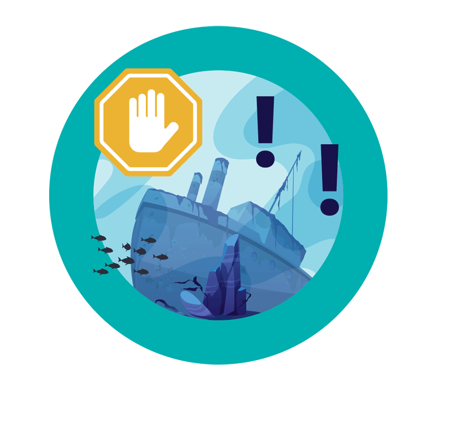 Mergulhar em naufrágios ou ruínas submersas pode ser perigoso. Respeite as instruções de segurança e a segurança dos equipamentos apropriados para os sítios em questão. Tome atenção à profundidade, ao tempo, às correntes e não entre em quaisquer cavidades, sem ser com permissão e tomando as maiores precauções. Nunca mergulhe sozinho. Preferencialmente mergulhe acompanhado por profissionais e guias qualificados e pesquise informação antes de o realizar.