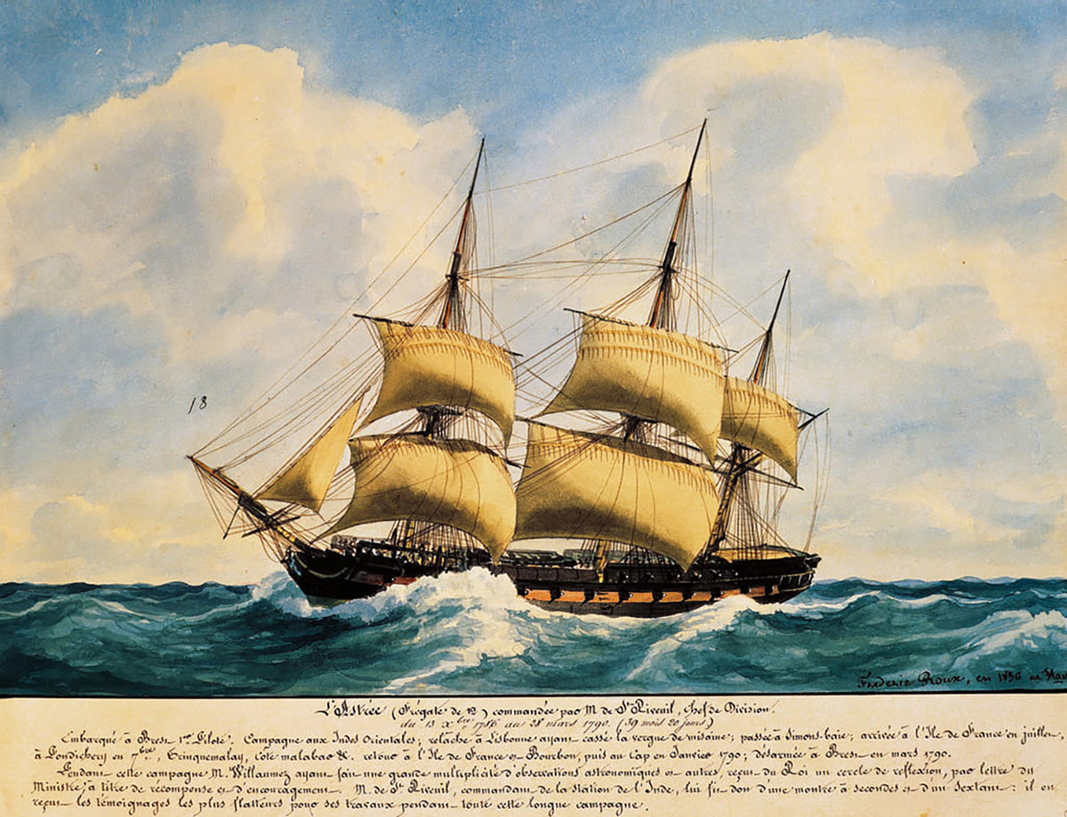 01. L’Astree, fragata francesa utilizada na rota das Índias Orientais entre 1786 e 1790, aguarela, c. 1825, Francois Geoffroy Roux (1811-1882)