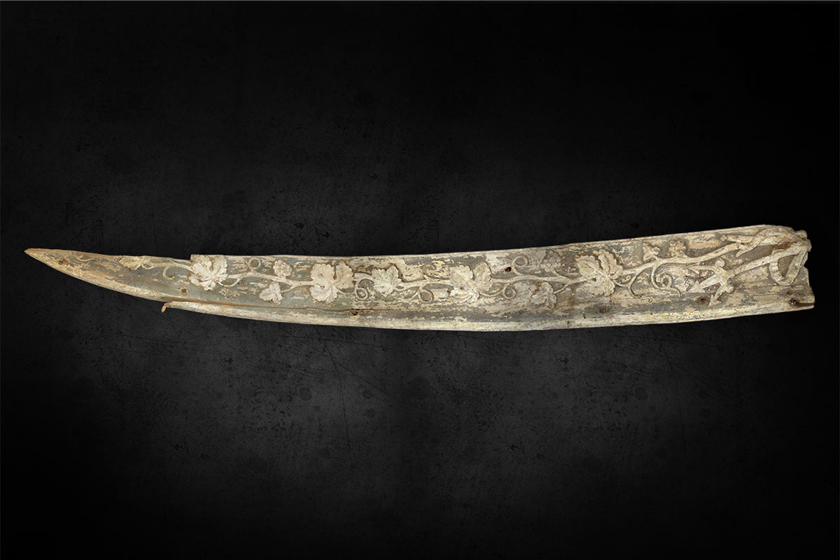 04. Tábua curvada e decorada da proa da barca Mont Ferran, com tridente de Neptuno e parreira, c. 1864.