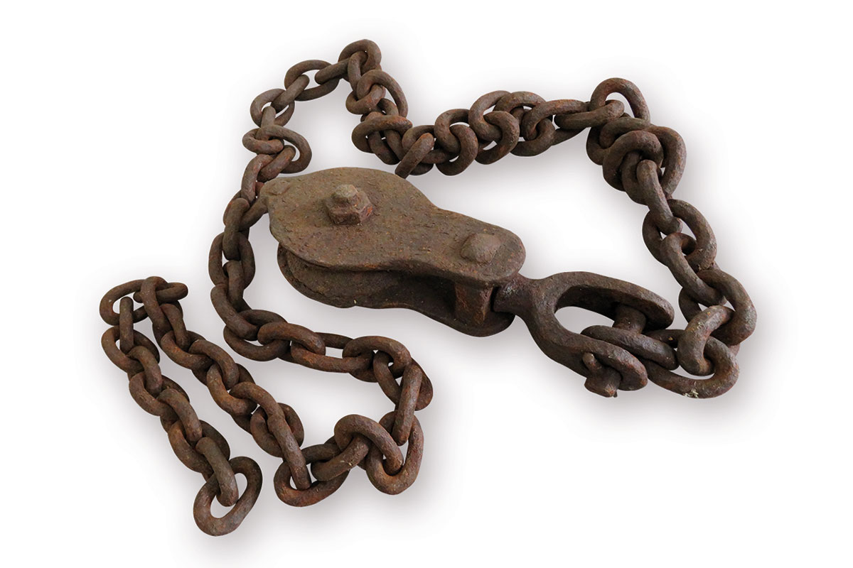07. Mecanismo de rolamento de correntes e corrente associada, em ferro, c. 1864.
