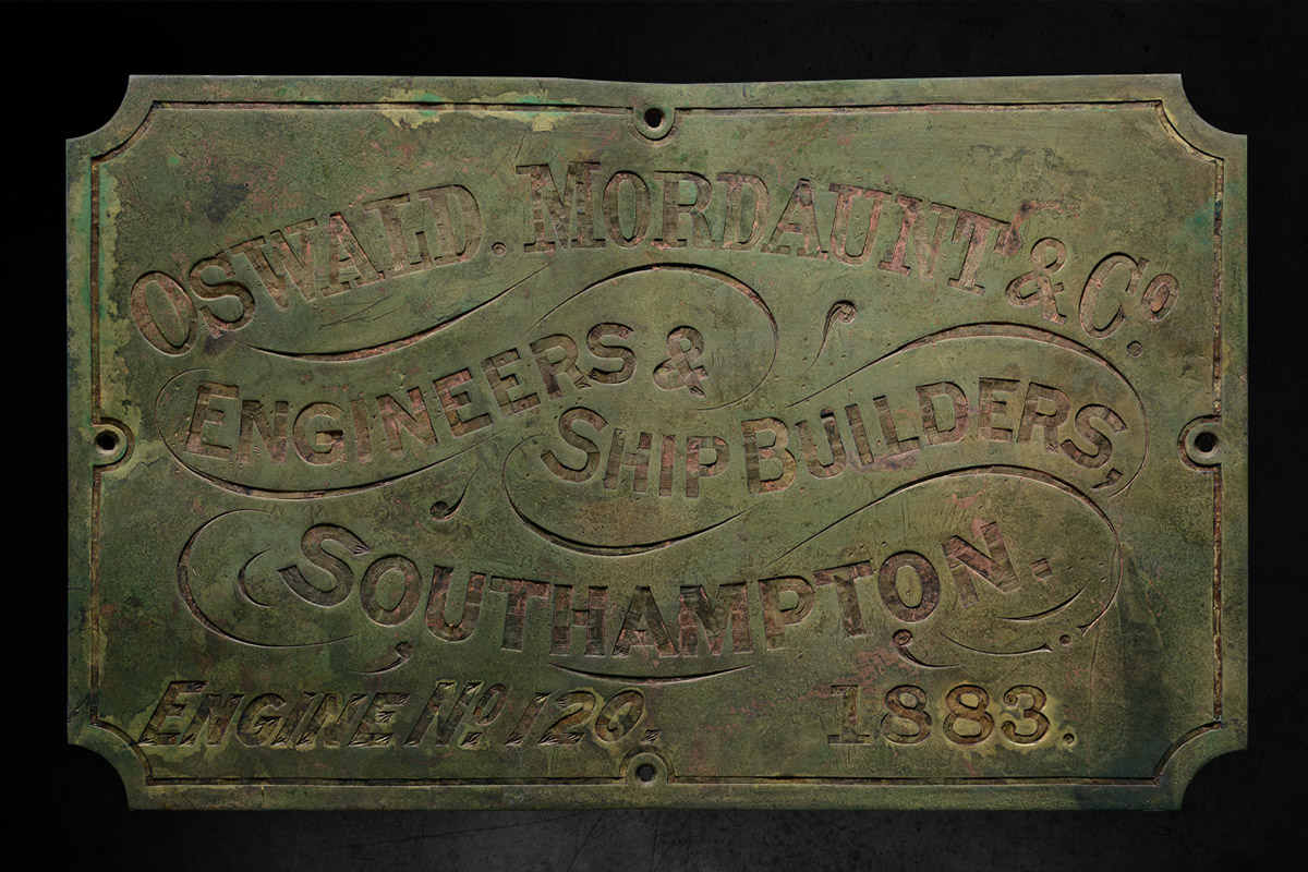 09. Oakfield. Placa de motor da com identificação do construtor Oswald Mordaunt & Co. Engineers & Shipbuilders, Southampton.
